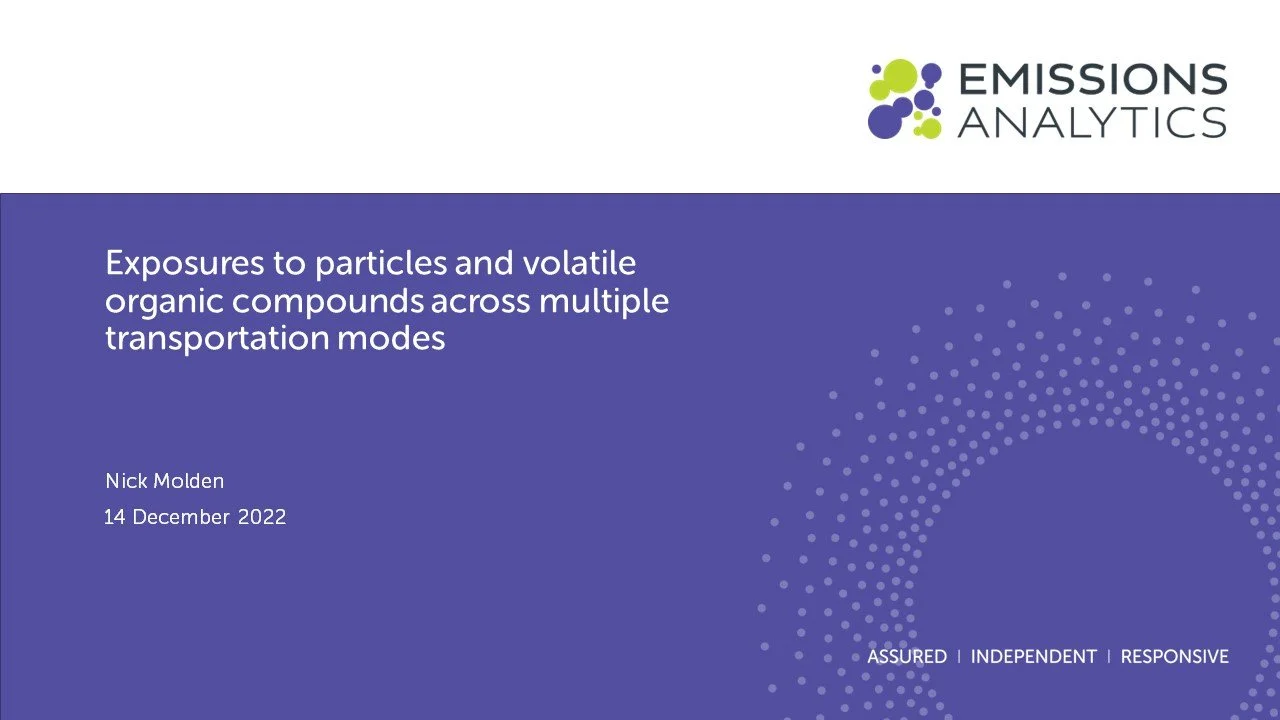 Our CEO & Founder, Nick Molden presented a webinar on Exposures to particles and volatile organic compounds across multiple transportation modes on 14th December 2022. To watch the webinar and download the presentation please see below.